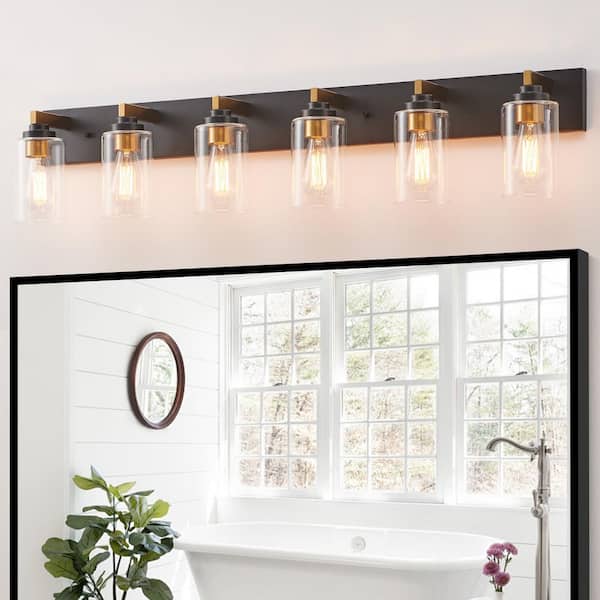 44 in. 6-Light Black and Gold Vanity Light with Clear Glass Shade