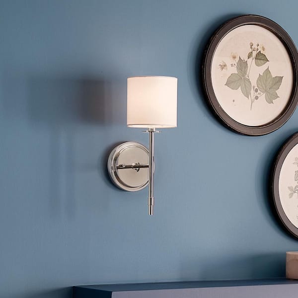 Ali 1-Light Polished Nickel Hallway Wall Sconce Light with White Fabric Shade