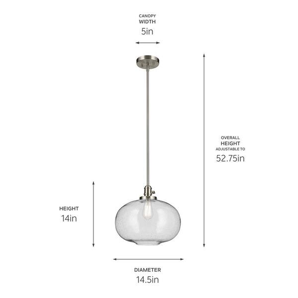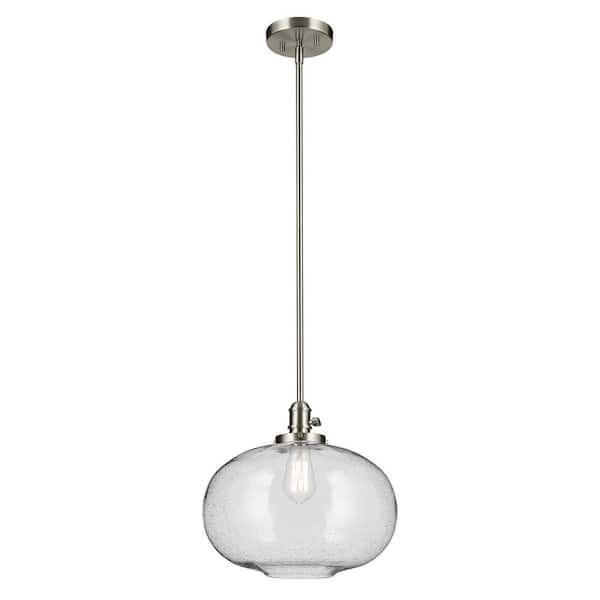 Avery 14.5 in. 1-Light Brushed Nickel Vintage Industrial Shaded Globe Kitchen Hanging Pendant Light with Seeded Glass
