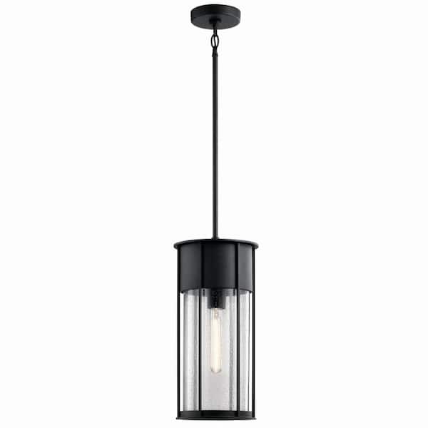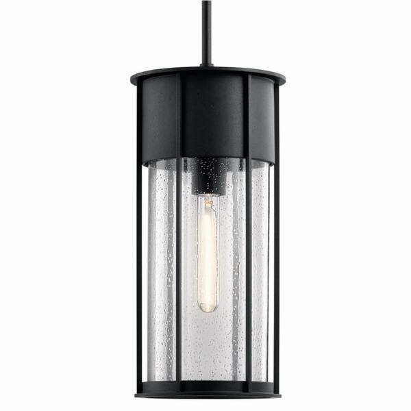 Camillo 18 in. 1-Light Textured Black Outdoor Porch Hanging Pendant Light with Clear Seeded Glass (1-Pack)