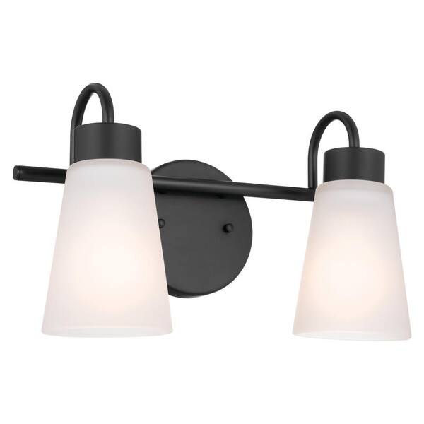 Erma 13.5 in. 2-Light Black Traditional Bathroom Vanity Light with Satin Etched Glass Shades