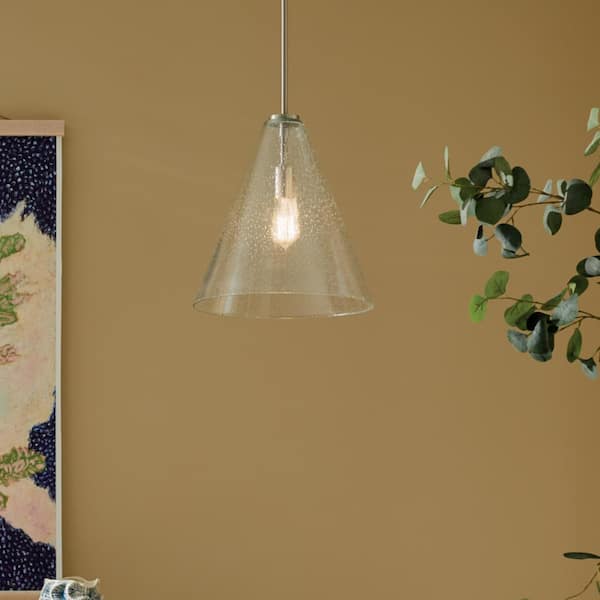 Everly 14.25 in. 1-Light Brushed Nickel Modern Shaded Cone Kitchen Hanging Pendant Light with Clear Seeded Glass