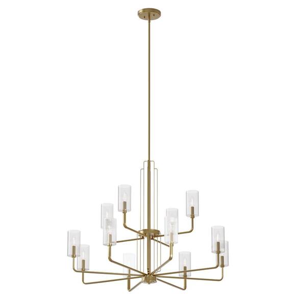 Kimrose 40.5 in. 12-Light Brushed Natural Brass Art Deco Candlestick Cylinder Chandelier for Dining Room