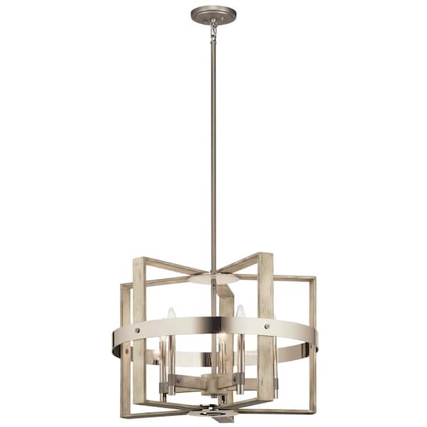 Peyton 26 in. 5-Light White Washed Wood and Nickel Farmhouse Candle Square Chandelier for Dining Room