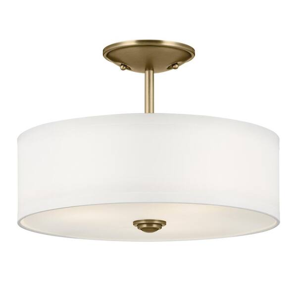 Shailene 14 in. 3-Light Natural Brass Round Hallway Transitional Semi-Flush Mount Ceiling Light with Microfiber Shade