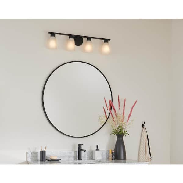 Stamos 31 in. 4-Light Black Modern Bathroom Vanity Light with Satin Etched Glass Shades