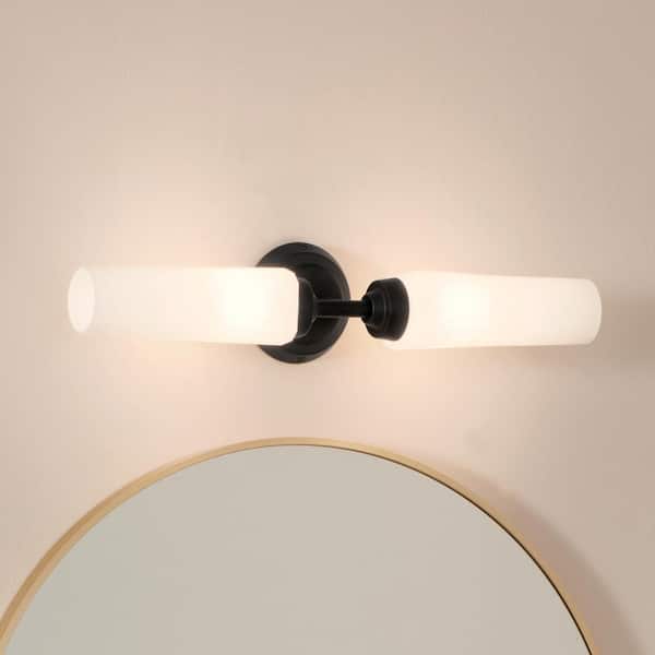 Truby 20.75 in. 2-Light Black Contemporary Bathroom Vanity Light with Satin Etched Cased Opal Glass