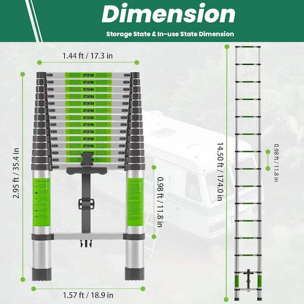 14.5 FT Aluminum Telescoping Ladder with Detachable Hooks, Compact Collapsible Design, Adjustable 15 Steps