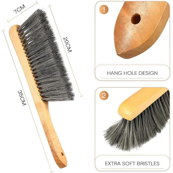 2-Pcs Wooden Bench Brushes Natural Fiber Soft Bristles Long Wood Handle Dust Removal for Hearth Car Home Workshop Gray