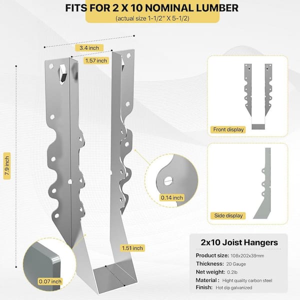 2 x 10 Galvanized 20-Gauge Joist Hangers Double Shear Face Mount Hurricane Ties Bracket for Floor Deck, Ceiling 20-Pack