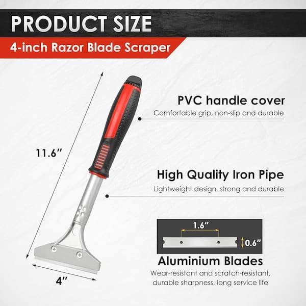 4 in. Razor Blade Scraper with Long-Handle, Heavy-Duty Cleaning Tool for Glass Walls and Tile Adhesive Removal