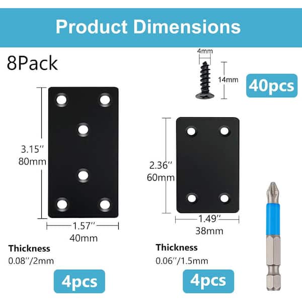 Black Flat Mending Plate 8 Pack Stainless Steel Straight Brace Fixing Joining Plate for Wood Furniture