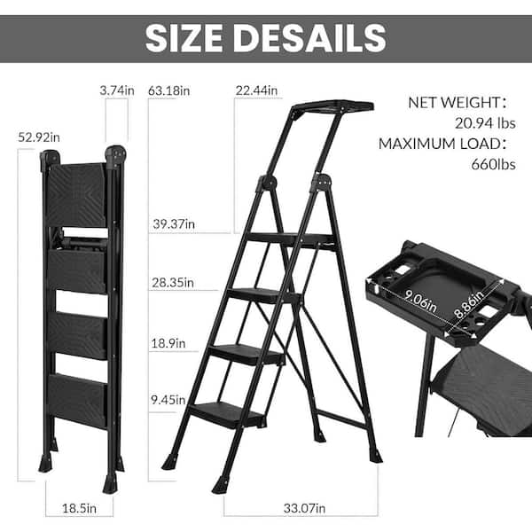 Foldable 4 Step Ladder with Handrail and Tool Tray, Anti-Slip Wide Pedal, 660 lbs. Sturdy Steel for Home Reach 50 in. H