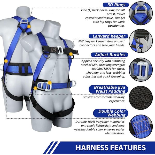 Full Body Safety Harness Fall Protection Kit with Shock Absorbing Lanyard and Padded Support for Construction Roofing