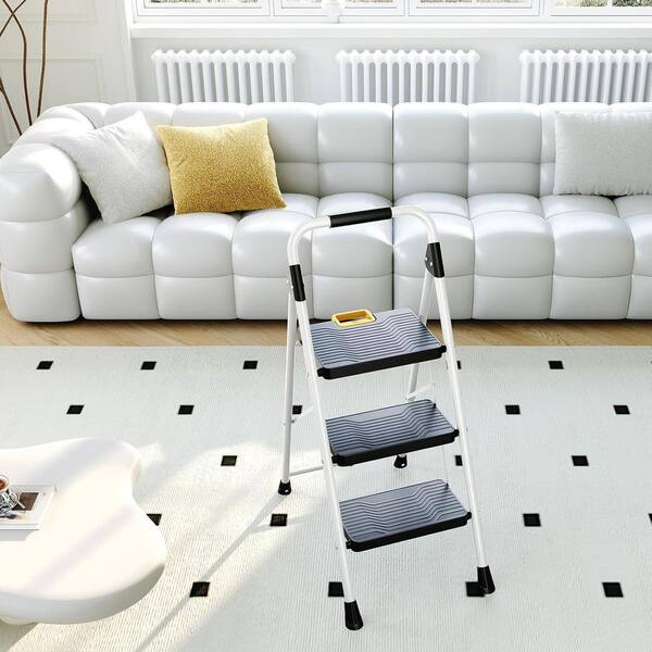 Reach 3 Step Folding Ladder with Safety Lock, 800 lbs. Non-Skid Wide Pedals, Handrail, Lightweight, White Aluminum