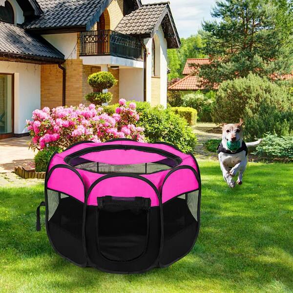 Small Pink Portable Foldable Pet Playpen Tent Crate with Zipper Top Steel, for Indoor Outdoor Fence Panel, Spaced Picket