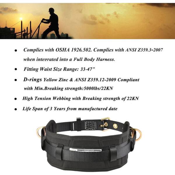 Waist Fitting 33 in. to 47 in. Tongue Buckle Body Belt with Waist Pad and 2 Side D-Rings for Work Positioning Safety