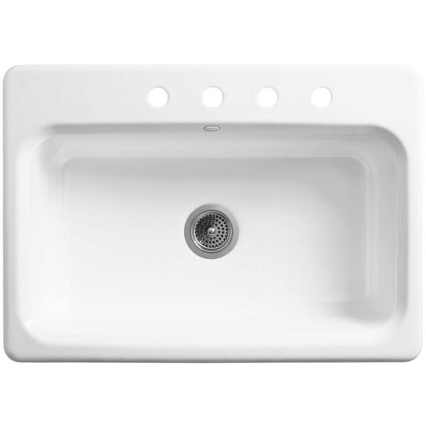 Bakersfield Drop-In Cast Iron 31 in. 4-Hole Single Bowl Kitchen Sink in White with Basin Rack