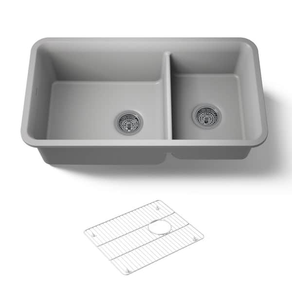 Cairn Undermount Neoroc Granite Composite 33.5 in. Double Bowl Kitchen Sink Kit in Matte Grey