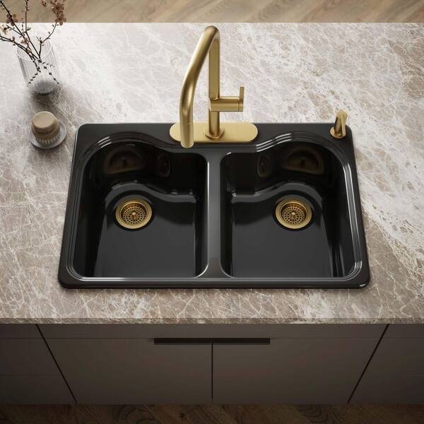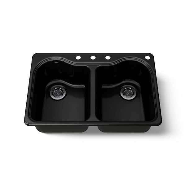 Hartland Drop-In Cast Iron 33 in. 4-Hole Double Bowl Kitchen Sink in Black Black