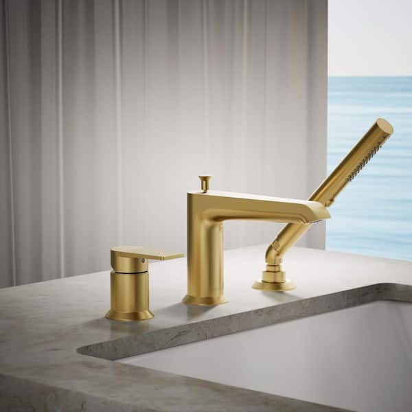 Hint Single-Handle Deck-Mount Roman Tub Faucet with Handshower in Vibrant Brushed Moderne Brass