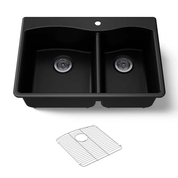Kennon Drop-In Neoroc Granite Composite 33 in. 1-Hole Double Bowl Kitchen Sink in Matte Black with Basin Rack
