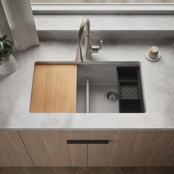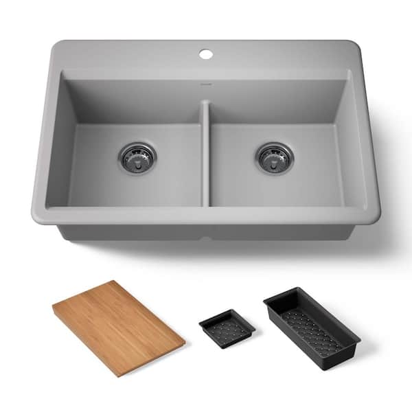 Lassen 33 in. Drop-in Double Bowl Granite Composite Kitchen Workstation Sink in Matte Grey with Accessories