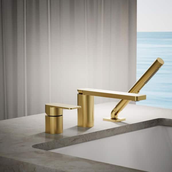 Parallel Single-Handle Deck-Mount Roman Tub Faucet with Handheld Shower Head in Vibrant Brushed Moderne Brass