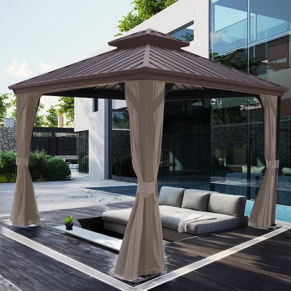 Caesar 10 ft. x 10 ft. Dark Brown Double Roof Permanent Hardtop Aluminum Gazebo with Netting and Sidewalls