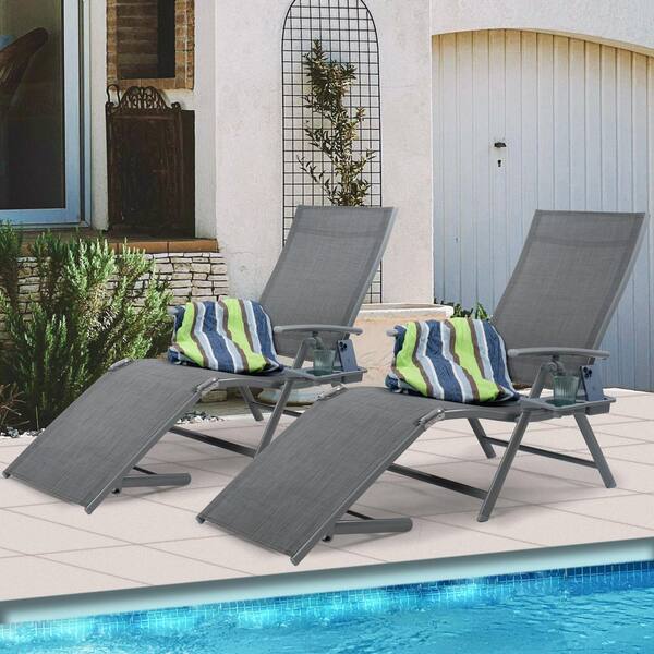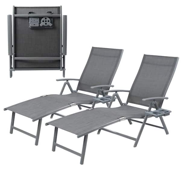 Cozy Aluminum Folding Outdoor Reclining 7 Adjustable Chaise Lounge Chair with Drink Holder Gray (2-Pack)