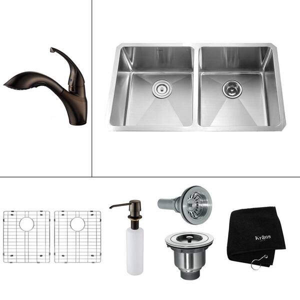 All-in-One Undermount Stainless Steel 32.75x19x14 in. 0-Hole Double Bowl Kitchen Sink with Oil Rubbed Bronze Accessories