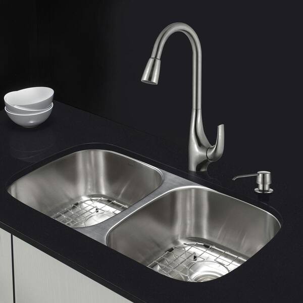 All-in-One Undermount Stainless Steel 32 in. Double Bowl Kitchen Sink with Faucet and Accessories in Stainless Steel