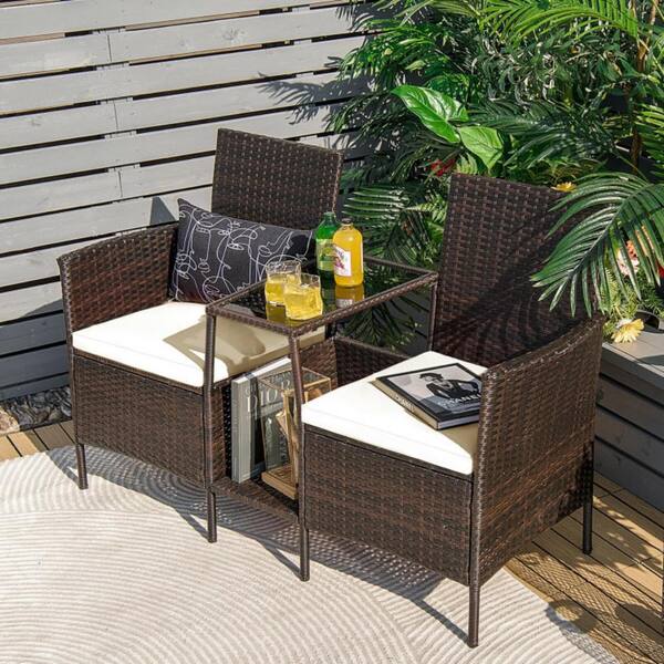 1-Piece Wicker Rattan Patio Conversation Set with Glass Table and White Cushions