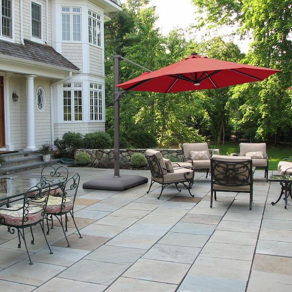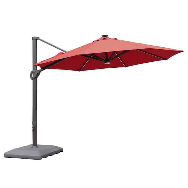 11 ft. Aluminum Pole Outdoor Cantilever Patio Umbrella in Red with Solar LED Light, Crank and Base