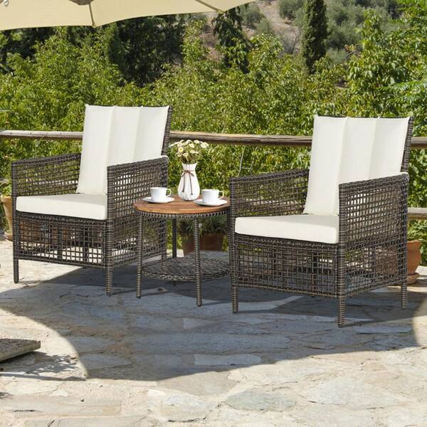 3 Pieces Patio Rattan Furniture Set with Cushion in White and Wood Table Top