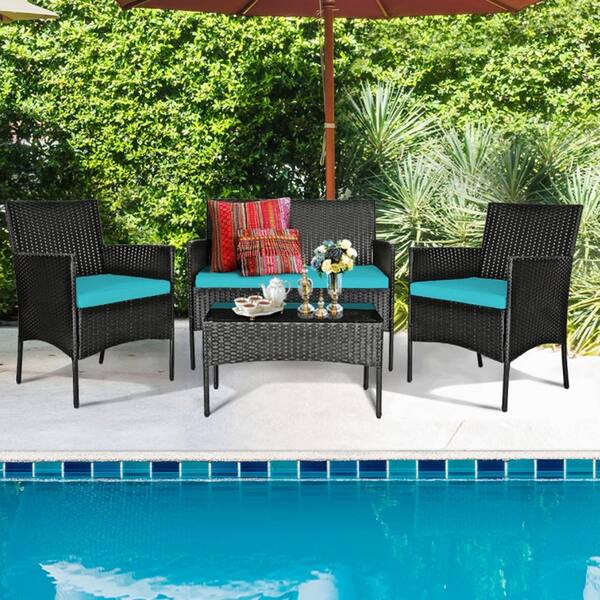 4-Piece Patio Metal Rattan Conversation Set with Tempered Glass Top Coffee Table & Seat Cushions in Turquoise