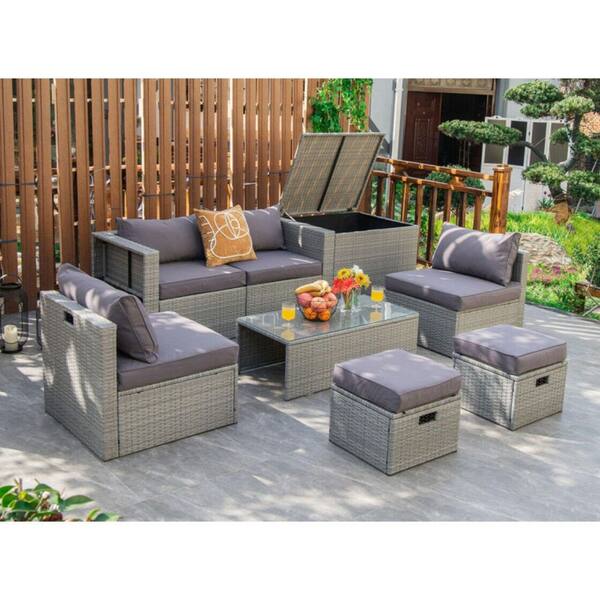8-Piece Patio Rattan Metal Patio Conversation Set with Cushions in Gray and Storage Table