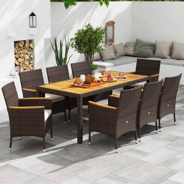 9-Piece Wicker Rectangle Outdoor Dining Set with Beige Cushions and Acacia Wood Table Top