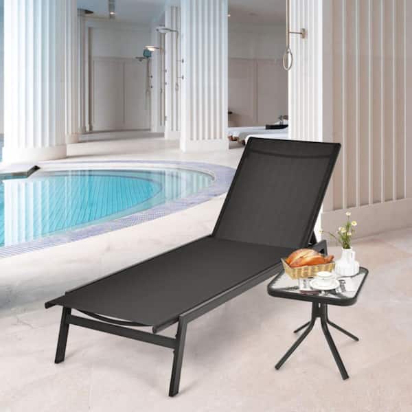 Black Steel Outdoor Chaise Lounge with Adjustable Backrest, Quick-drying Lounge Chair for Yard Poolside Sunbathing