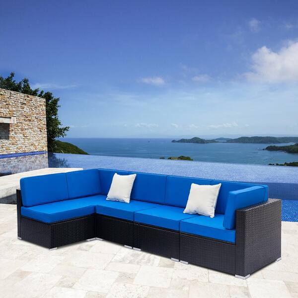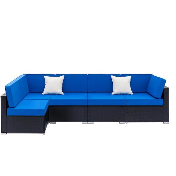 5-Piece Black Wicker Outdoor Sectional Set with Blue Cushion