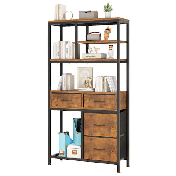 68.5 in. Tall Brown Metal 7-Shelf Etagere Bookcase with Fabric Drawers, Storage