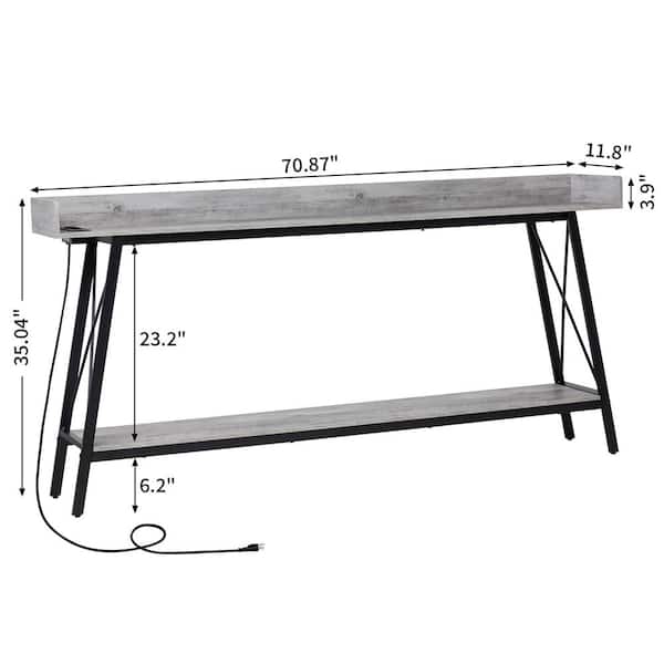 70.9 in. Extra Long Gray Rectangle MDF Console Table with 2-Power Outlets and USB Ports, Steel Frame