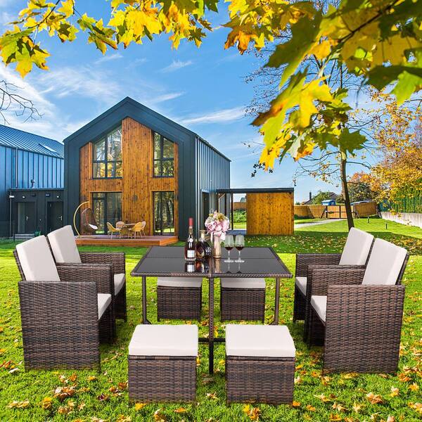 Black Frame 9-Piece Brown Wicker Outdoor Dining Set with Beige Cushion