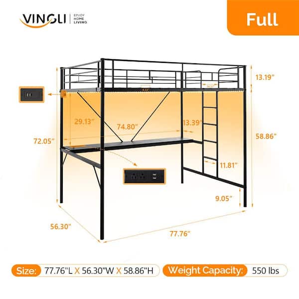 Black Twin Size Metal Loft Bunk Bed Frame for Kids Teens Adults with Desk Underneath,2 Charging Station,LED Lights