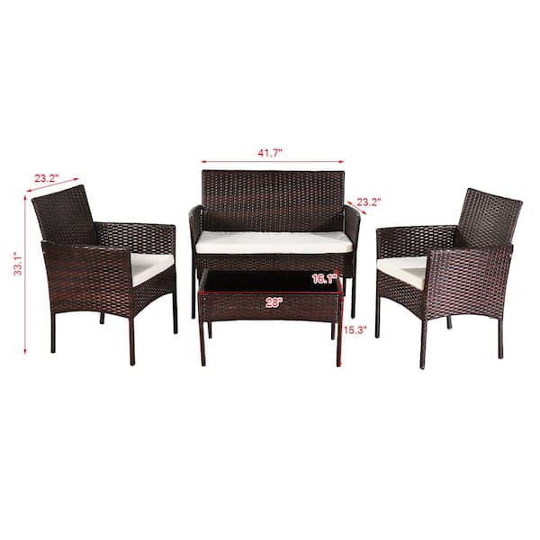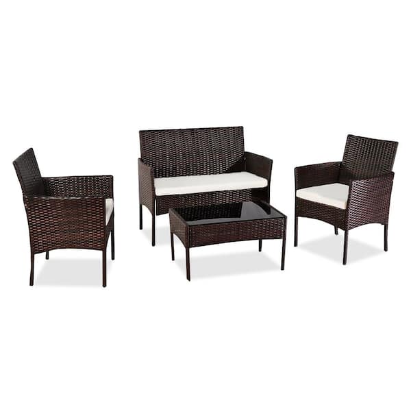 Brown 4-Piece Wicker Patio Conversation Set with Off White Cushions