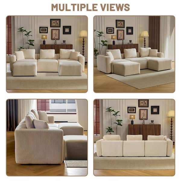 Compressed Block's Collection 112 in. W Square Arm Corduroy U-shaped Modern Sofa in Off-White with Ottoman