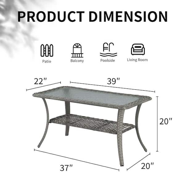 Gray Rectangular Patio Wicker Coffee Table With Glass Top