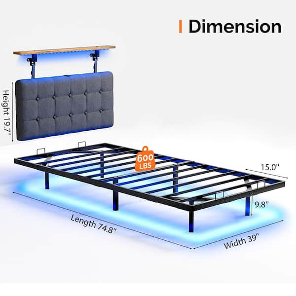 Gray Twin Size Floating Metal Bed Frame with Hanging Linen Headboard