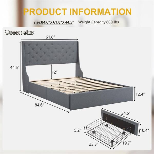 Gray Upholstered Metal Frame Queen Size Platform Bed with 4 Drawers, Wingback Headboard with Button Tufted Design