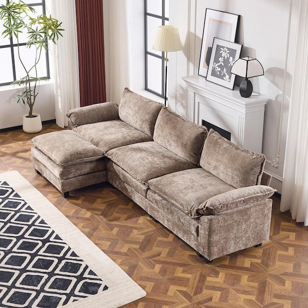 KD 120 in. Pillow Top Arm Chenille L-shaped Sofa in Brown with Ottoman